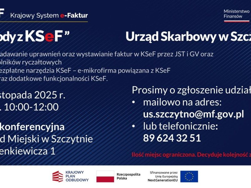 Urząd Skarbowy w Szczytnie organizuje bezpłatne szkolenie o Krajowym Systemie e-Faktur. Spotkanie odbędzie się 19 listopada w ratuszu. Liczba miejsc jest ograniczona — decyduje...