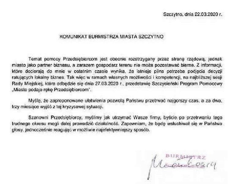 Komunikat Burmistrza Miasta Szczytno dotyczący pomocy dla przedsiębiorców.
