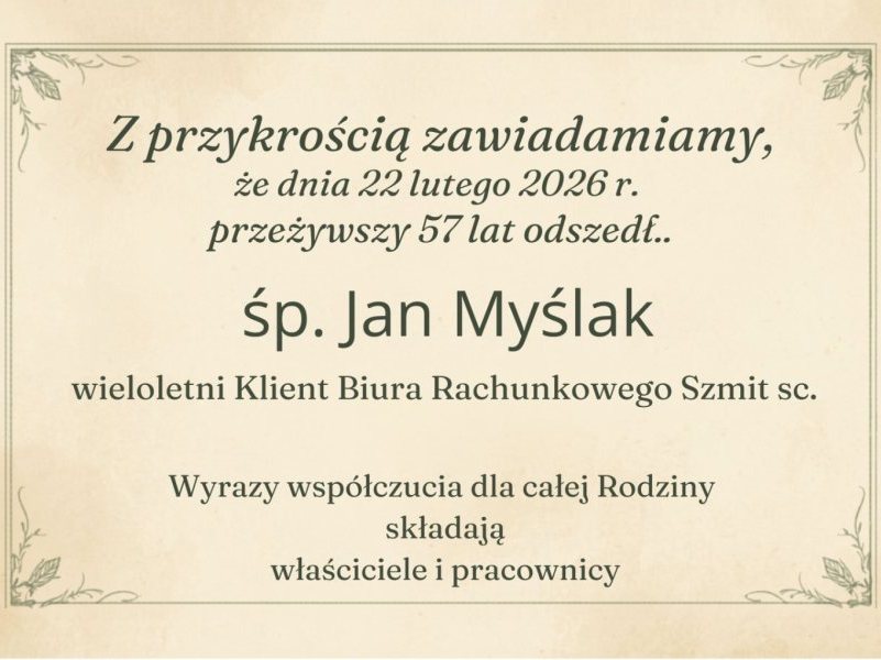 Z głębokim smutkiem przyjęliśmy wiadomość, że 22 lutego 2026 roku, przeżywszy 57 lat, odszedł śp. Jan Myślak – wieloletni Klient Biura Rachunkowego Szmit sc.
