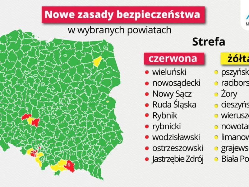 Od piątku 18 powiatów będzie objętych obostrzeniami - strefami żółtymi i czerwonymi - czyli o jeden mniej niż dotychczas - poinformował w czwartek wiceminister zdrowia Janusz Cieszyński....