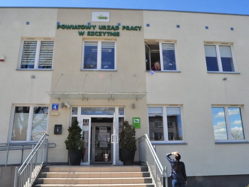 Jak widać na zdjęciu dyrektor Powiatowego Urzędu Pracy Beata Januszczyk ima się najróżniejszych sposobów, by przyspieszyć procedury. Tu – najzwyczajniej – rzutem z okna...