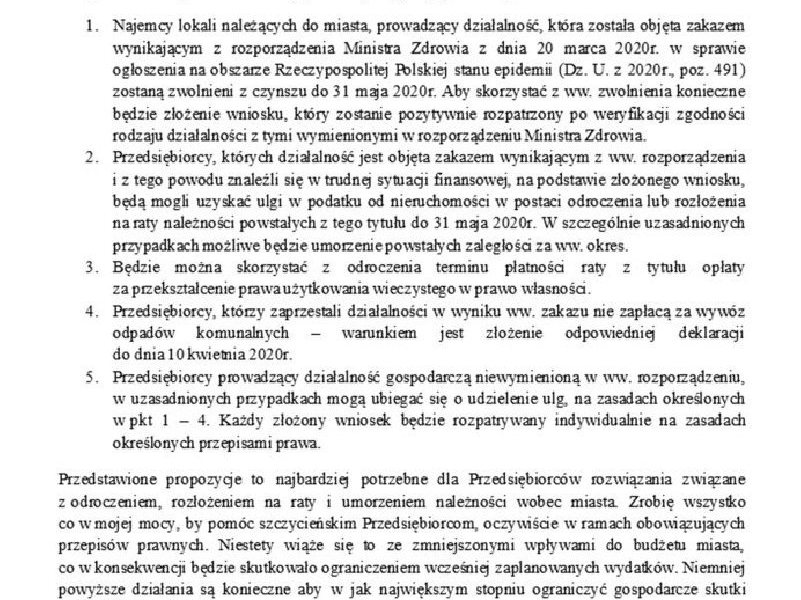 Komunikat Burmistrza Miasta Szczytno dotyczący pomocy dla przedsiębiorców.