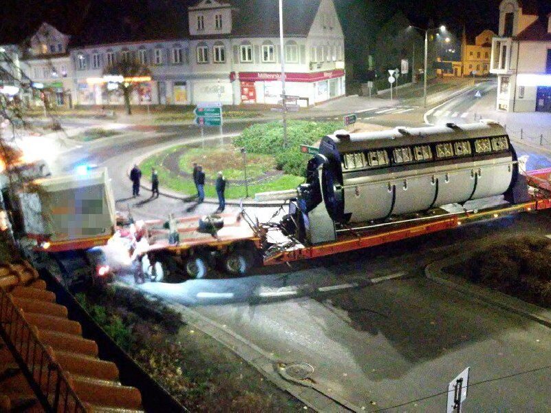 Potężny ciągnik siodłowy, przewożący ładunek ponadgabarytowy, nie wyrobił się na szczycieńskim rondzie. Auto wypadło z jezdni, skosiło betonowy krawężnik, słupki ogrodzeniowe i... oparło...