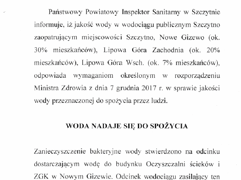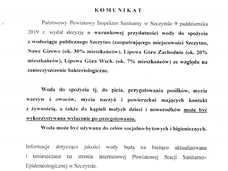 Szczyciński sanepid wydał komunikat, w którym informuje, że woda z wodociągu publicznego Szczytno jest zanieczyszczona bakteriologicznie i jest dopuszczona do spożycia warunkowo. Z...