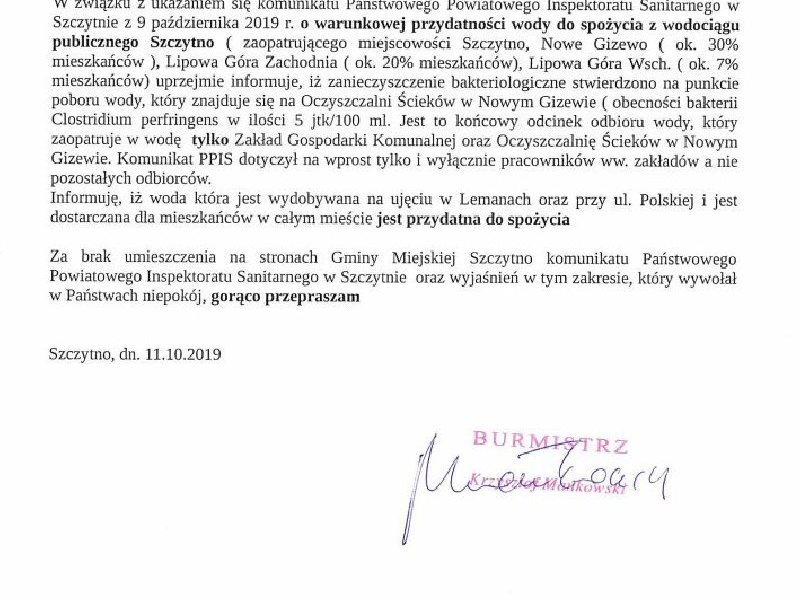 Oświadczenie Burmistrza Miasta Szczytno o warunkach przydatności wody do spożycia z wodociągu publicznego Szczytno.