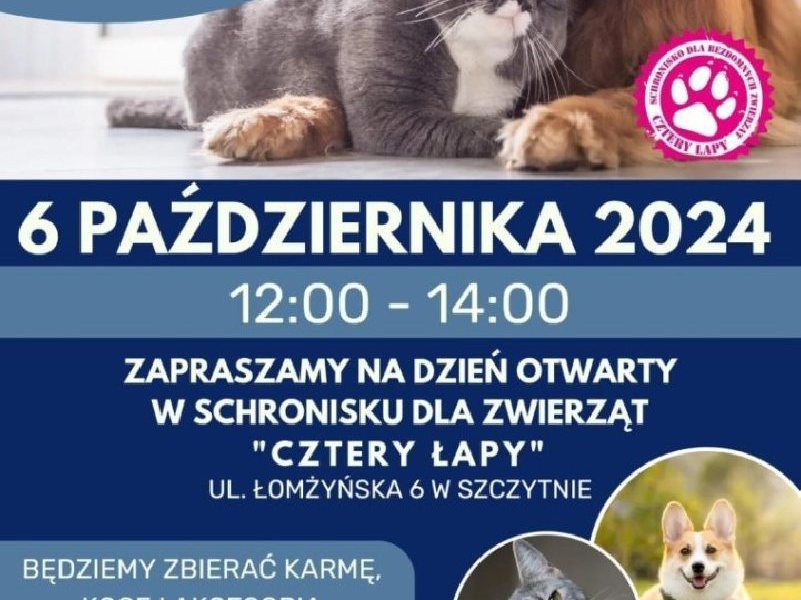 W niedzielę, 6 października, w godzinach 12:00 - 14:00, Schronisko dla Zwierząt "Cztery Łapy" w Szczytnie przy ul. Łomżyńskiej 6 otworzy swoje drzwi dla wszystkich mieszkańców...