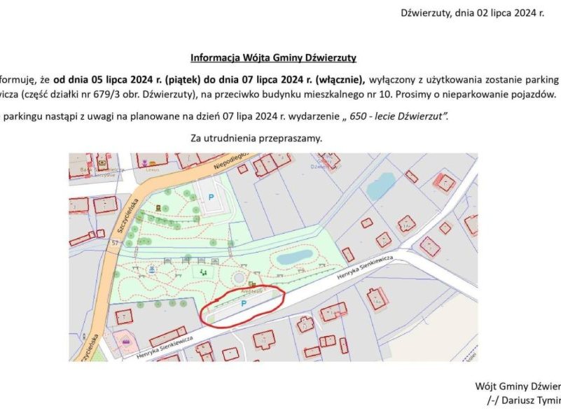Od 5 do 7 lipca parking przy parku w Dźwierzutach, znajdujący się przy ul. Sienkiewicza, będzie niedostępny. Gmina Dźwierzuty informuje, że zmiana ta jest związana z przygotowaniami do...