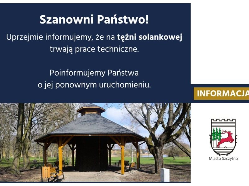 Miejski ratusz w Szczytnie poinformował mieszkańców, że tężnia solankowa w parku przy ulicy Pasymskiej jest obecnie nieczynna z powodu trwających prac technicznych.