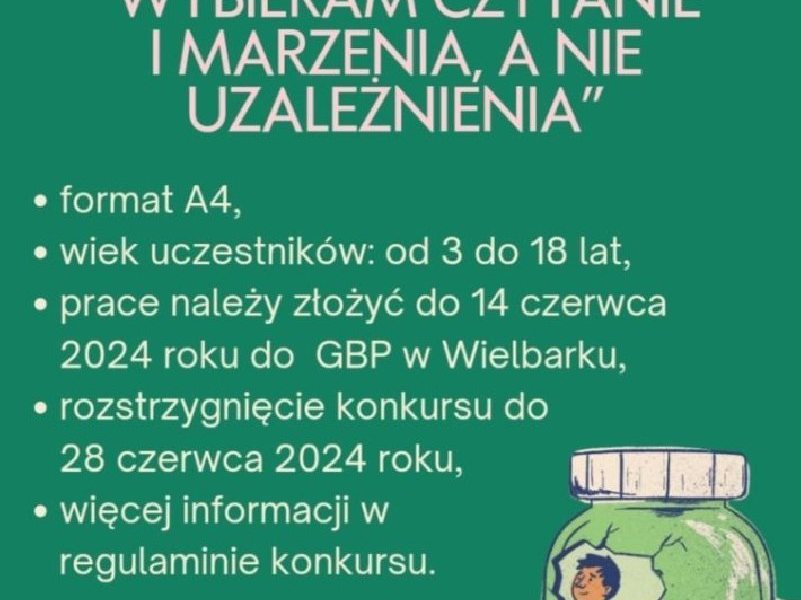 Gminna Biblioteka Publiczna w Wielbarku zaprasza dzieci i młodzież do wzięcia udziału w konkursie plastycznym pod hasłem „Wybieram czytanie i marzenia, a nie uzależnienia”.