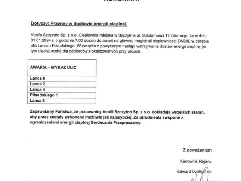Veolia Szczytno informuje o przerwie w dostawie energii cieplnej w obrębie ul. Lanca oraz ul. Piłsudskiego w dniu 31.01.2024 r.