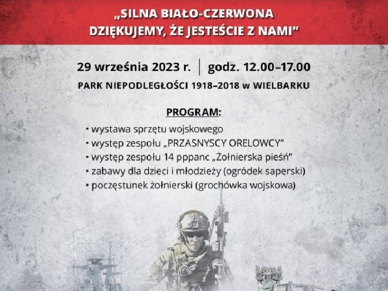 Już jutro (piątek, 29 września) w Wielbarku odbędzie się wyjątkowe wydarzenie. O godzinie 12.00 rozpocznie się PIKNIK WOJSKOWY zatytułowany "SILNA BIAŁO-CZERWONA DZIĘKUJEMY, ŻE...