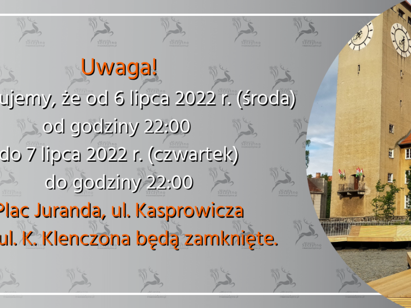 Urząd Miejski w Szczytnie poinformowała, że od 6 lipca 2022 r. (środa) od godziny 22:00 do 7 lipca 2022 r. (czwartek) do godziny 22:00 Plac Juranda, ul. Kasprowicza oraz ul. K. Klenczona...