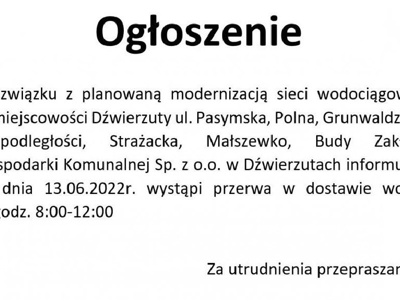 W poniedziałek, 13 czerwca w Dźwierzutach na ulicach: Pasymskiej, Polnej, Grunwaldzkiej, Niepodległości, Strażackiej oraz Małszewku i Budach pojawią się przerwy w dostawach wody.