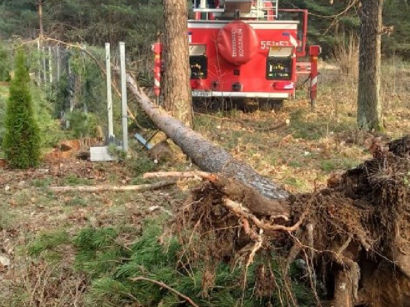 W Siedliskach drzewo przewróciło się na inne drzewo, które z kolei niebezpiecznie zawisło nad domkiem letniskowym.