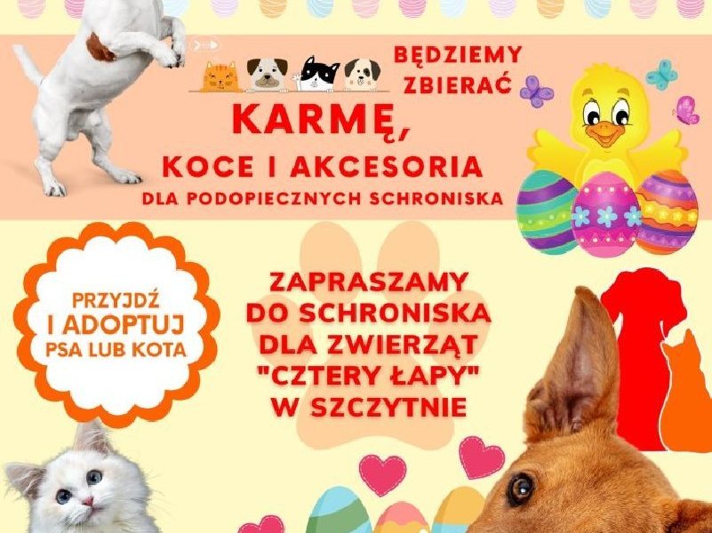 Ruszyła Wielkanocna zbiórka karmy na rzecz Schroniska „Cztery Łapy” w Szczytnie. Potrzebna jest karma, ale też koce i inne akcesoria dla czworonożnych podpieczonych...