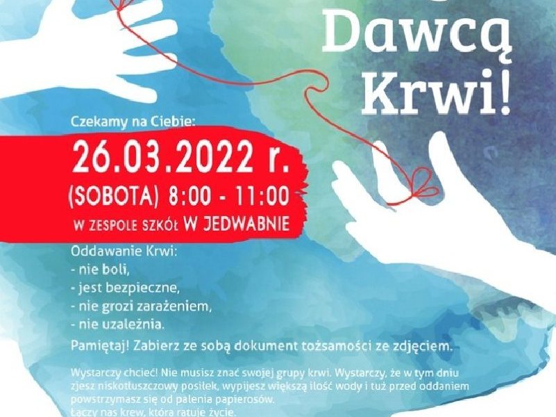 Na sobotę, 26 marca w Zespole Szkół w Jedwabnie zaplanowano akcję poboru krwi. Ten życiodajny płyn będzie można oddać w godzinach od 8 do 11.