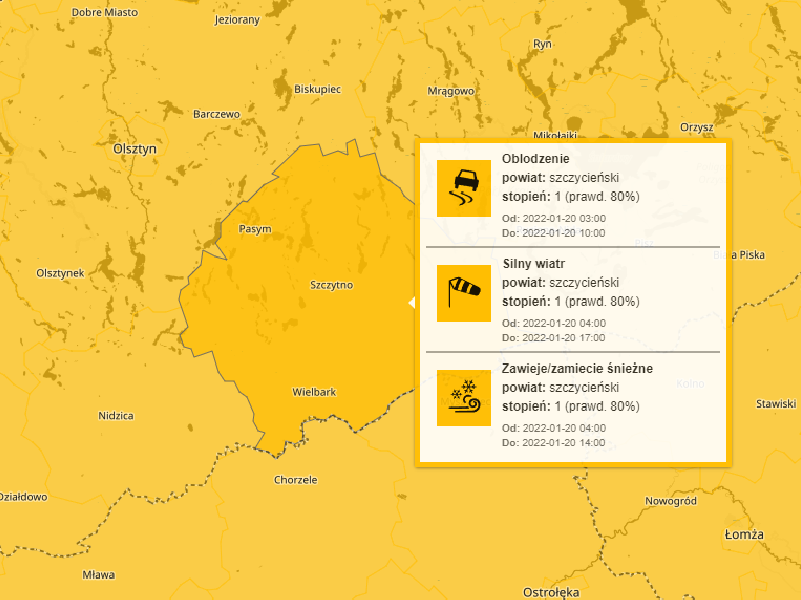 Wydział Centralnego Biura Prognoz Meteorologicznych w Białymstoku wydaje dla powiatu szczycieńskiego następujące ostrzeżenia meteorologiczne.