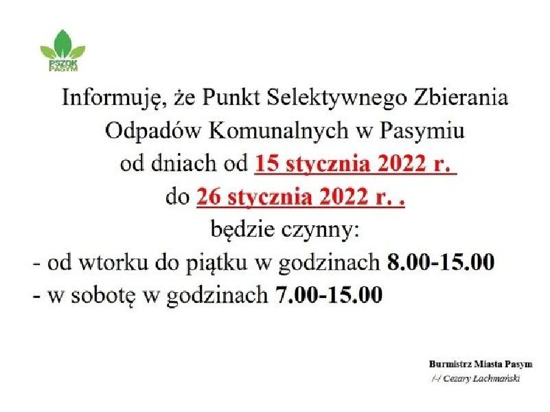 Informacja o zmianie godzin pracy PSZOK w Pasymiu 15.01.2022 r. - 26.01.2022 r.