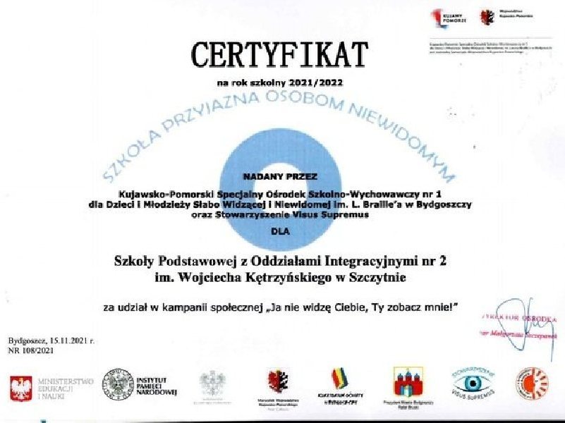 Szkoła Podstawowa nr 2 w Szczytnie z Oddziałami Integracyjnymi otrzymała certyfikat „SZKOŁA PRZYJAZNA OSOBOM NIEWIDOMYM”. Nadany został on naszej placówce przez...