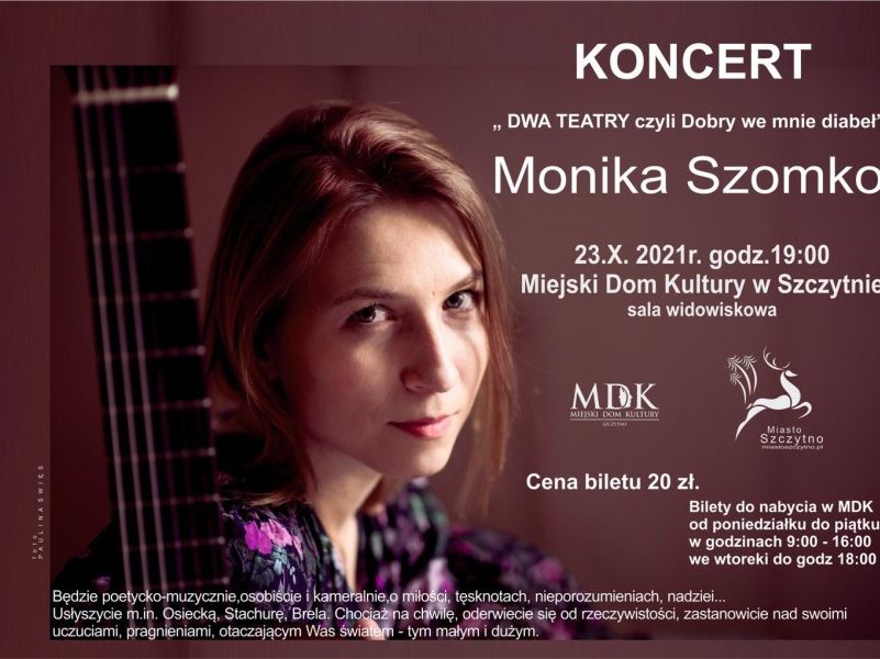 W sobotę, 23 października w Miejskim Domy Kultury w Szczytnie odbędzie się koncert Moniki Szomko pod tytułem "DWA TEATRY czyli Dobry ze mnie diabeł". Początek godz. 19....