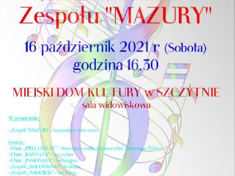 Na sobotę, 16 października zaplanowano uroczyste obchody 25-lecia zespołu Mazury. Wydarzenie odbędzie się w Miejskim Domu Kultury. Wstęp wolny. Szczegóły na plakacie.