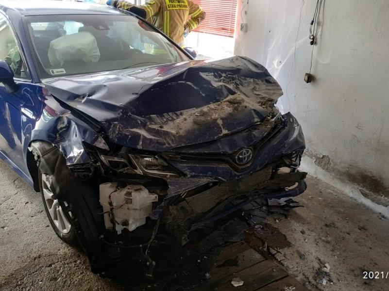 Zniszczona brama wjazdowa na posesję, uszkodzona ściana budynku oraz zdemolowany samochód toyota camry – taki widok zastali strażacy na jednej z posesji przy ulicy Bohaterów...