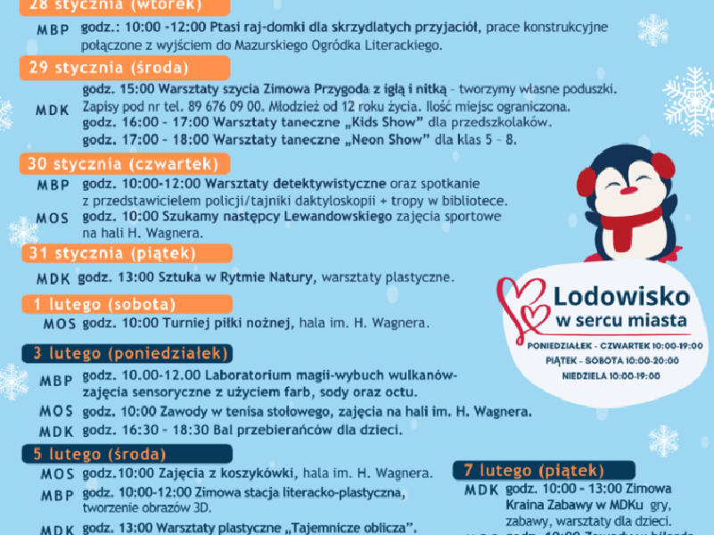 Od 27 stycznia do 9 lutego Szczytno zmienia się w krainę zimowych przygód. Dla dzieci i młodzieży przygotowano bogaty program pełen warsztatów, zajęć sportowych i kreatywnych atrakcji.